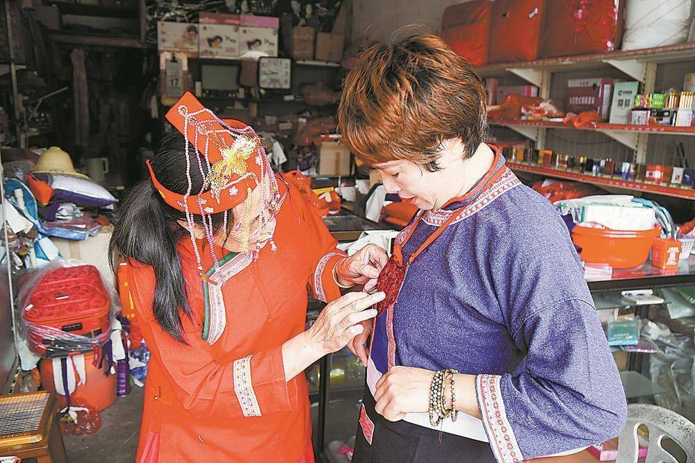 66岁的郑晓花(左)指导钟新花绣围裙上的斑纹。